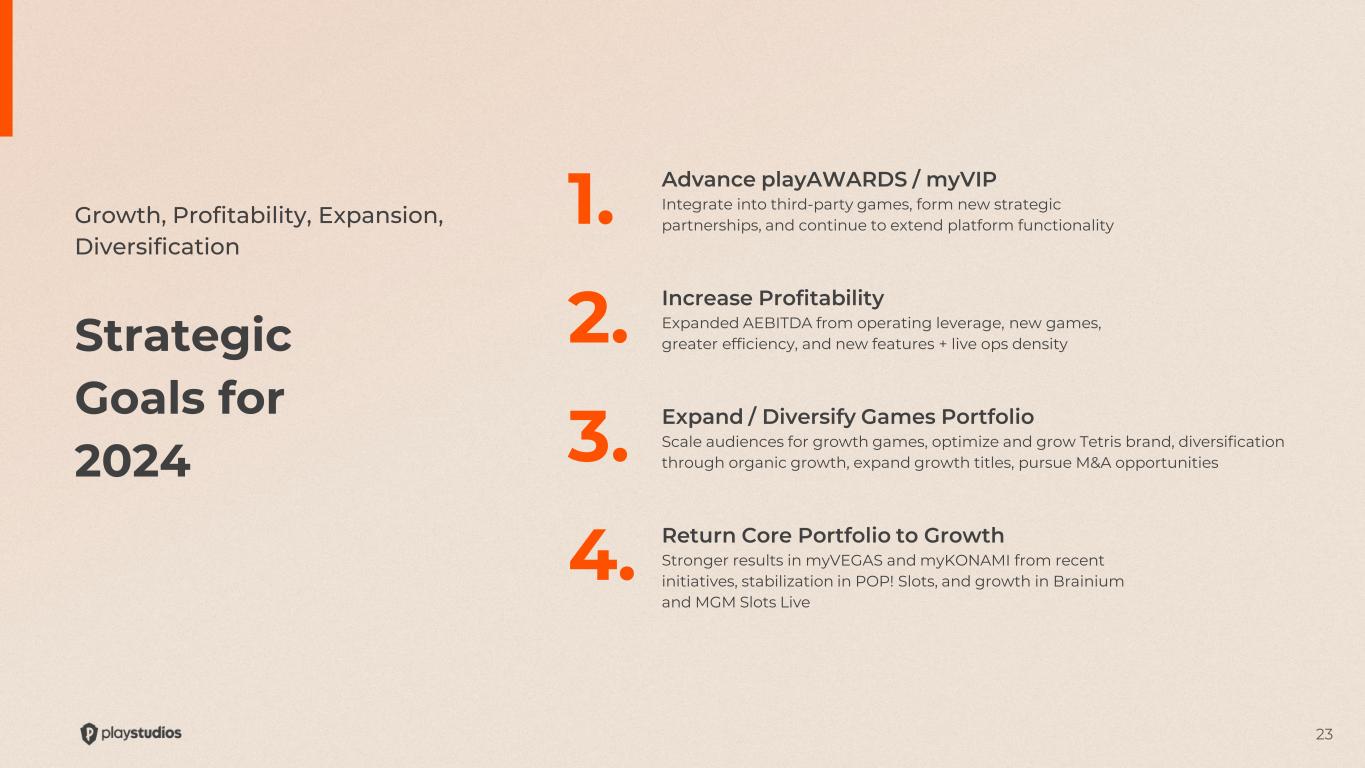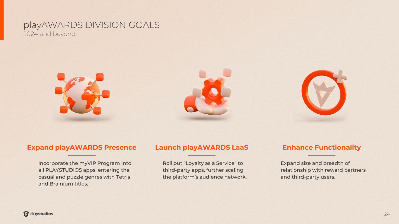 23 1. Advance playAWARDS / myVIP Integrate into third-party games, form new strategic partnerships, and continue to extend platform functionality 2. Increase Profitability Expanded AEBITDA from operating leverage, new games, greater efficiency, and new features + live ops density 3. Expand / Diversify Games Portfolio Scale audiences for growth games, optimize and grow Tetris brand, diversification through organic growth, expand growth titles, pursue M&A opportunities 4. Return Core Portfolio to Growth Stronger results in myVEGAS and myKONAMI from recent initiatives, stabilization in POP! Slots, and growth in Brainium and MGM Slots Live Strategic Goals for 2024 Growth, Profitability, Expansion, Diversification