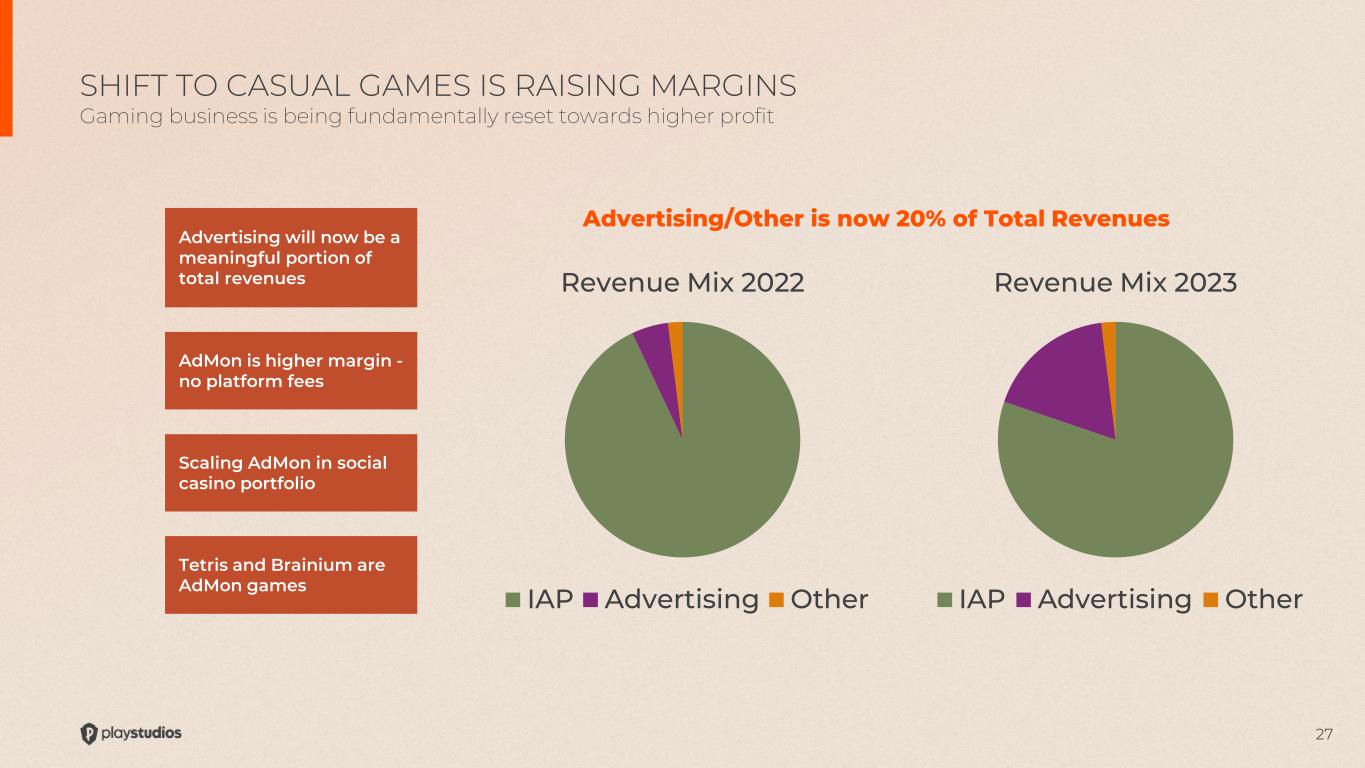 26 MYPS 2023 ~20% AEBITDA Margins Peer Group ~28% AEBITDA Margins Leverage Fixed Costs Optimize Profitability of Newest Games Improve Profitability of Core Portfolio STRONG MARGINS GAINS IN 2023 CAN CONTINUE Our current initiatives support continued margin growth MYPS 2022 ~13% AEBITDA Margins +700bps GOAL MARGIN OPTIMIZATION FOCUS