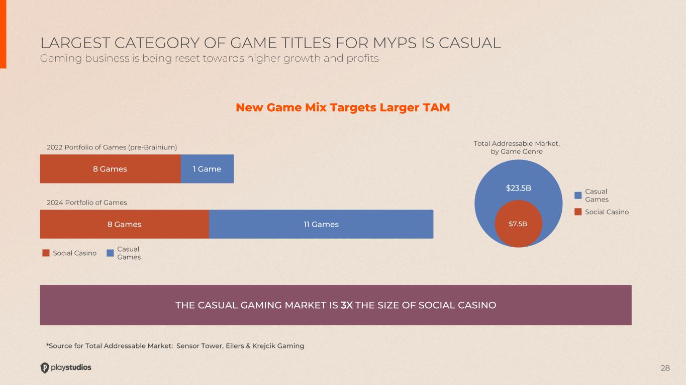 27 Advertising will now be a meaningful portion of total revenues AdMon is higher margin - no platform fees Advertising/Other is now 20% of Total Revenues Scaling AdMon in social casino portfolio Tetris and Brainium are AdMon games SHIFT TO CASUAL GAMES IS RAISING MARGINS Gaming business is being fundamentally reset towards higher profit Revenue Mix 2022 IAP Advertising Other Revenue Mix 2023 IAP Advertising Other