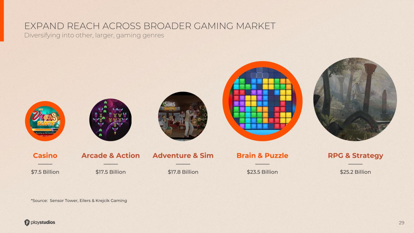 28 THE CASUAL GAMING MARKET IS 3X THE SIZE OF SOCIAL CASINO New Game Mix Targets Larger TAM 2024 Portfolio of Games 2022 Portfolio of Games (pre-Brainium) Social Casino Casual Games $7.5B Total Addressable Market, by Game Genre $23.5B 8 Games 1 Game 8 Games 11 Games Social Casino Casual Games LARGEST CATEGORY OF GAME TITLES FOR MYPS IS CASUAL Gaming business is being reset towards higher growth and profits *Source for Total Addressable Market: Sensor Tower, Eilers & Krejcik Gaming