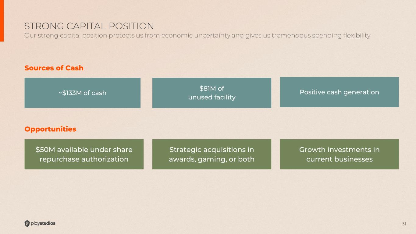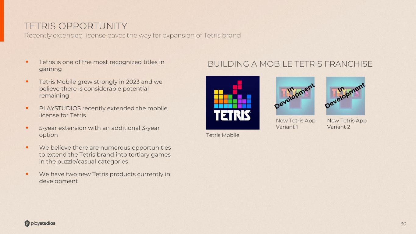 30 ▪ Tetris is one of the most recognized titles in gaming ▪ Tetris Mobile grew strongly in 2023 and we believe there is considerable potential remaining ▪ PLAYSTUDIOS recently extended the mobile license for Tetris ▪ 5-year extension with an additional 3-year option ▪ We believe there are numerous opportunities to extend the Tetris brand into tertiary games in the puzzle/casual categories ▪ We have two new Tetris products currently in development TETRIS OPPORTUNITY Recently extended license paves the way for expansion of Tetris brand Tetris Mobile New Tetris App Variant 1 New Tetris App Variant 2 BUILDING A MOBILE TETRIS FRANCHISE