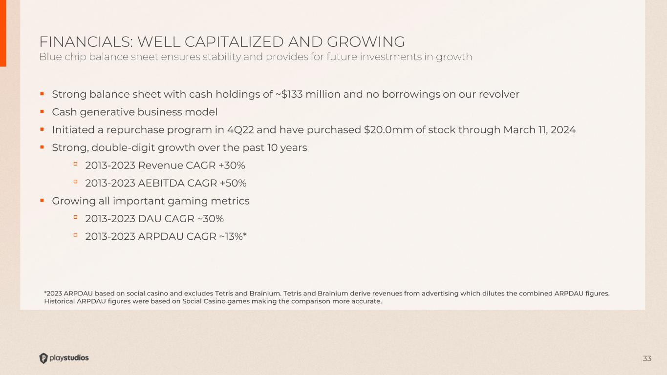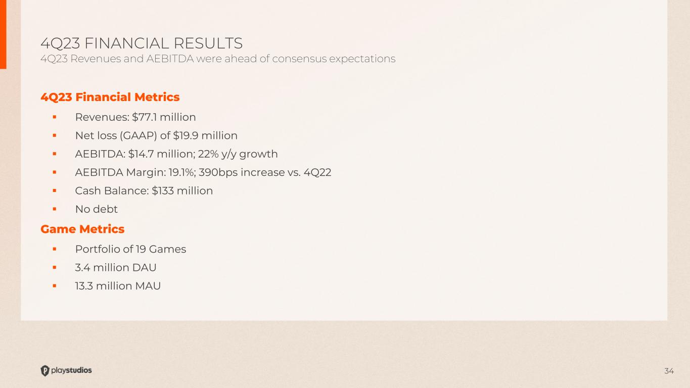 33 ▪ Strong balance sheet with cash holdings of ~$133 million and no borrowings on our revolver ▪ Cash generative business model ▪ Initiated a repurchase program in 4Q22 and have purchased $20.0mm of stock through March 11, 2024 ▪ Strong, double-digit growth over the past 10 years ▫ 2013-2023 Revenue CAGR +30% ▫ 2013-2023 AEBITDA CAGR +50% ▪ Growing all important gaming metrics ▫ 2013-2023 DAU CAGR ~30% ▫ 2013-2023 ARPDAU CAGR ~13%* FINANCIALS: WELL CAPITALIZED AND GROWING Blue chip balance sheet ensures stability and provides for future investments in growth *2023 ARPDAU based on social casino and excludes Tetris and Brainium. Tetris and Brainium derive revenues from advertising which dilutes the combined ARPDAU figures. Historical ARPDAU figures were based on Social Casino games making the comparison more accurate.