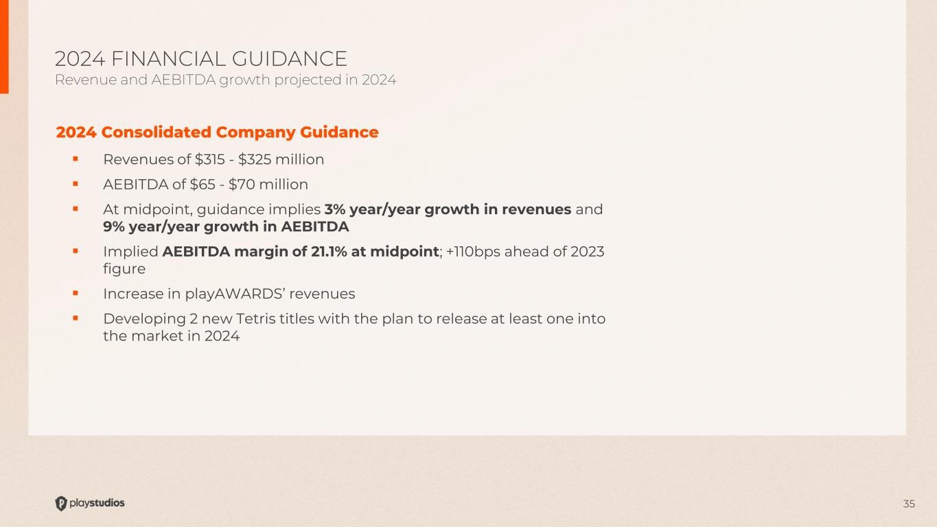 34 4Q23 Financial Metrics ▪ Revenues: $77.1 million ▪ Net loss (GAAP) of $19.9 million ▪ AEBITDA: $14.7 million; 22% y/y growth ▪ AEBITDA Margin: 19.1%; 390bps increase vs. 4Q22 ▪ Cash Balance: $133 million ▪ No debt Game Metrics ▪ Portfolio of 19 Games ▪ 3.4 million DAU ▪ 13.3 million MAU 4Q23 FINANCIAL RESULTS 4Q23 Revenues and AEBITDA were ahead of consensus expectations