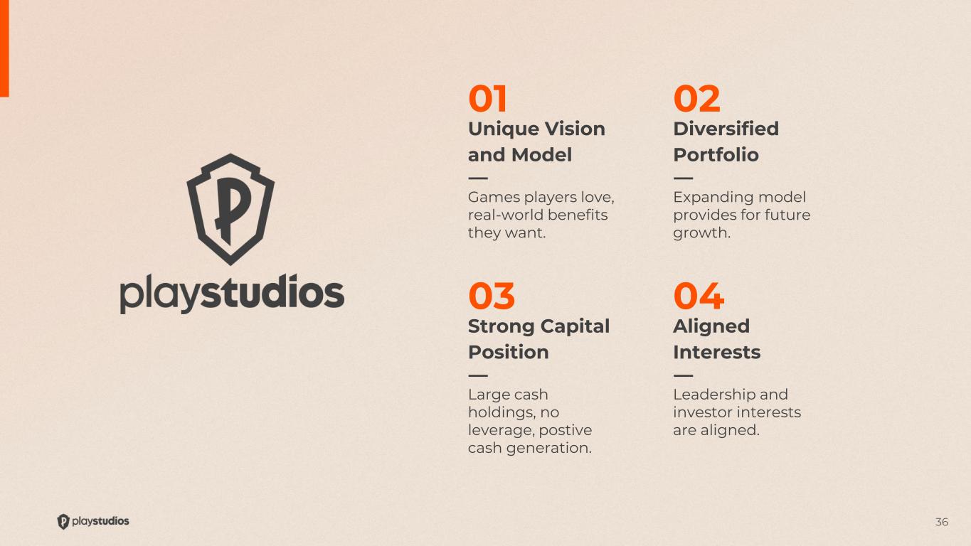 36 01 02 Unique Vision and Model Games players love, real-world benefits they want. Diversified Portfolio Expanding model provides for future growth. 03 04 Strong Capital Position Large cash holdings, no leverage, postive cash generation. Aligned Interests Leadership and investor interests are aligned.