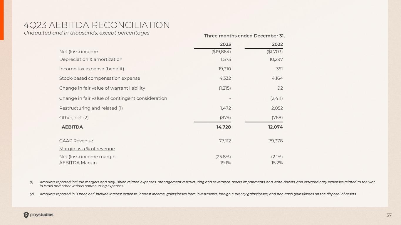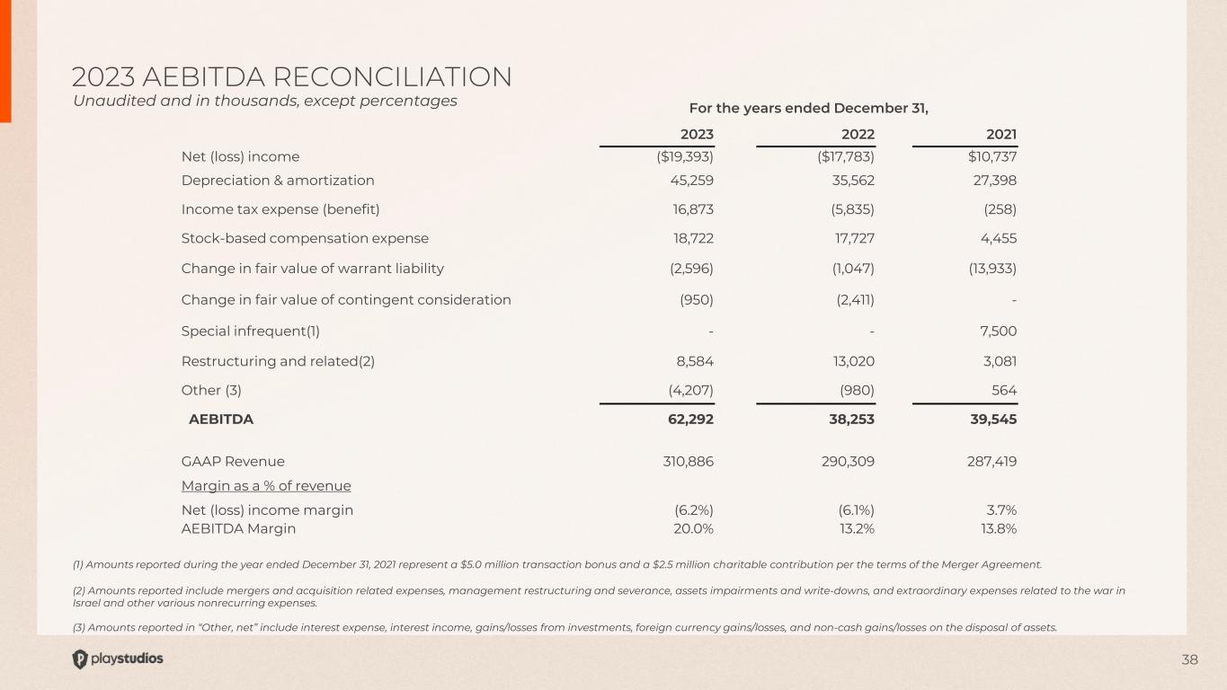 37 (1) Amounts reported include mergers and acquisition related expenses, management restructuring and severance, assets impairments and write-downs, and extraordinary expenses related to the war in Israel and other various nonrecurring expenses. (2) Amounts reported in “Other, net” include interest expense, interest income, gains/losses from investments, foreign currency gains/losses, and non-cash gains/losses on the disposal of assets. 4Q23 AEBITDA RECONCILIATION Unaudited and in thousands, except percentages Three months ended December 31, 2023 2022 Net (loss) income ($19,864) ($1,703) Depreciation & amortization 11,573 10,297 Income tax expense (benefit) 19,310 351 Stock-based compensation expense 4,332 4,164 Change in fair value of warrant liability (1,215) 92 Change in fair value of contingent consideration - (2,411) Restructuring and related (1) 1,472 2,052 Other, net (2) (879) (768) AEBITDA 14,728 12,074 GAAP Revenue 77,112 79,378 Margin as a % of revenue Net (loss) income margin (25.8%) (2.1%) AEBITDA Margin 19.1% 15.2%