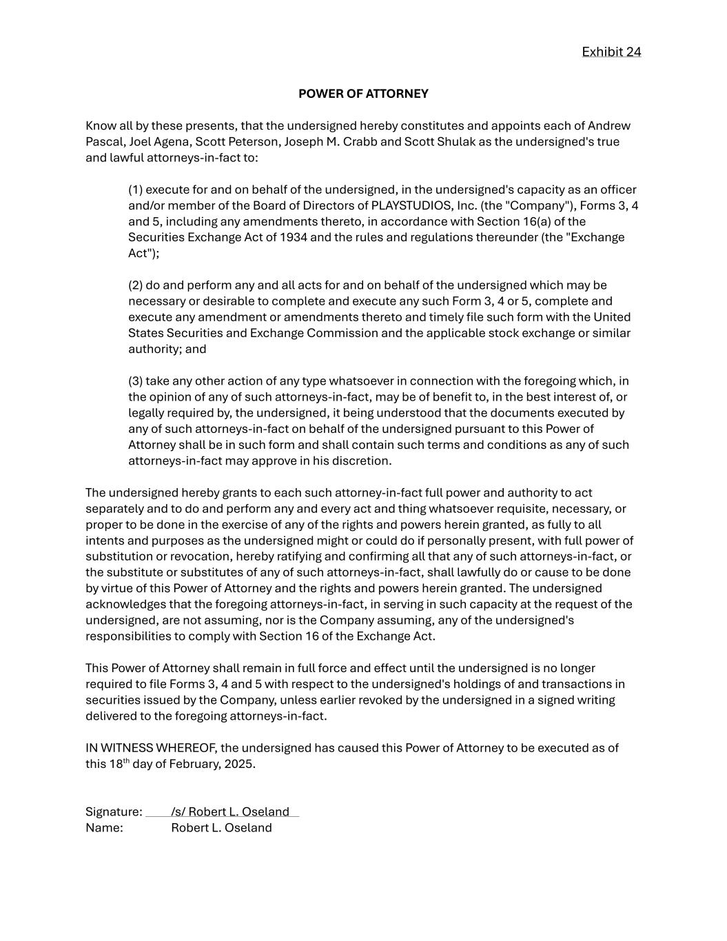 Exhibit 24 POWER OF ATTORNEY Know all by these presents, that the undersigned hereby constitutes and appoints each of Andrew Pascal, Joel Agena, Scott Peterson, Joseph M. Crabb and Scott Shulak as the undersigned's true and lawful attorneys-in-fact to: (1) execute for and on behalf of the undersigned, in the undersigned's capacity as an oFicer and/or member of the Board of Directors of PLAYSTUDIOS, Inc. (the "Company"), Forms 3, 4 and 5, including any amendments thereto, in accordance with Section 16(a) of the Securities Exchange Act of 1934 and the rules and regulations thereunder (the "Exchange Act"); (2) do and perform any and all acts for and on behalf of the undersigned which may be necessary or desirable to complete and execute any such Form 3, 4 or 5, complete and execute any amendment or amendments thereto and timely file such form with the United States Securities and Exchange Commission and the applicable stock exchange or similar authority; and (3) take any other action of any type whatsoever in connection with the foregoing which, in the opinion of any of such attorneys-in-fact, may be of benefit to, in the best interest of, or legally required by, the undersigned, it being understood that the documents executed by any of such attorneys-in-fact on behalf of the undersigned pursuant to this Power of Attorney shall be in such form and shall contain such terms and conditions as any of such attorneys-in-fact may approve in his discretion. The undersigned hereby grants to each such attorney-in-fact full power and authority to act separately and to do and perform any and every act and thing whatsoever requisite, necessary, or proper to be done in the exercise of any of the rights and powers herein granted, as fully to all intents and purposes as the undersigned might or could do if personally present, with full power of substitution or revocation, hereby ratifying and confirming all that any of such attorneys-in-fact, or the substitute or substitutes of any of such attorneys-in-fact, shall lawfully do or cause to be done by virtue of this Power of Attorney and the rights and powers herein granted. The undersigned acknowledges that the foregoing attorneys-in-fact, in serving in such capacity at the request of the undersigned, are not assuming, nor is the Company assuming, any of the undersigned's responsibilities to comply with Section 16 of the Exchange Act. This Power of Attorney shall remain in full force and eFect until the undersigned is no longer required to file Forms 3, 4 and 5 with respect to the undersigned's holdings of and transactions in securities issued by the Company, unless earlier revoked by the undersigned in a signed writing delivered to the foregoing attorneys-in-fact. IN WITNESS WHEREOF, the undersigned has caused this Power of Attorney to be executed as of this 18th day of February, 2025. Signature: /s/ Robert L. Oseland Name: Robert L. Oseland